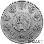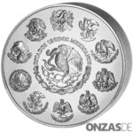Los cambios del anverso de estas onzas de plata son también notables, introduciendo los diferentes escudos históricos Mexicanos rodeando al principal escudo nacional, formando una bonita pieza de arte.